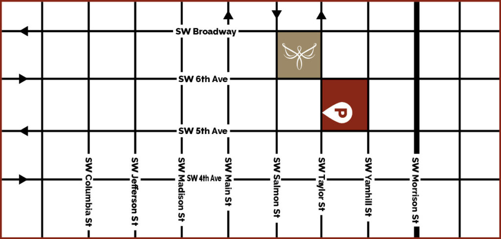 The parking structure is located diagonally across the street from the Hilton Hotel at The Dunaway. The entrance is located on  SW Taylor Street between SW 5th and 6th Avenue. Look for Mount Angel Abbey & Seminary signage.