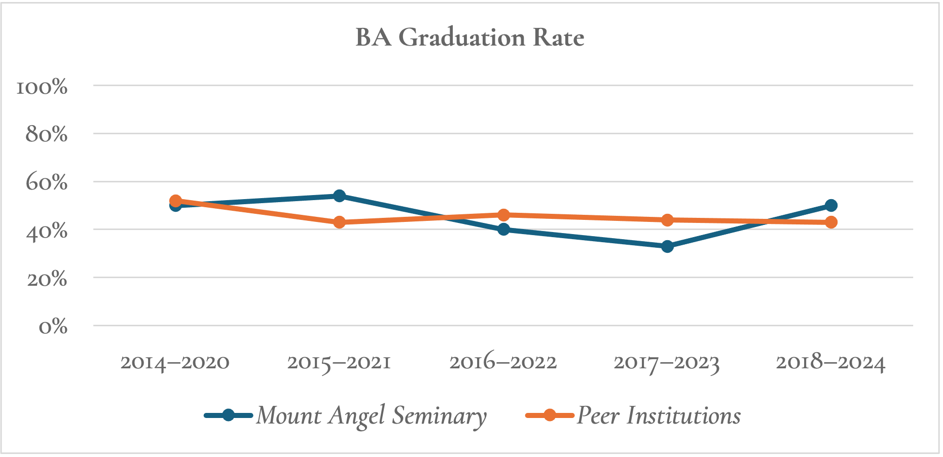 The total number of BA degrees completed between 2020 and 2024 is 39. The following table and chart show the graduation rate of the BA program in comparison with the average of certain other Catholic seminaries in the United States: