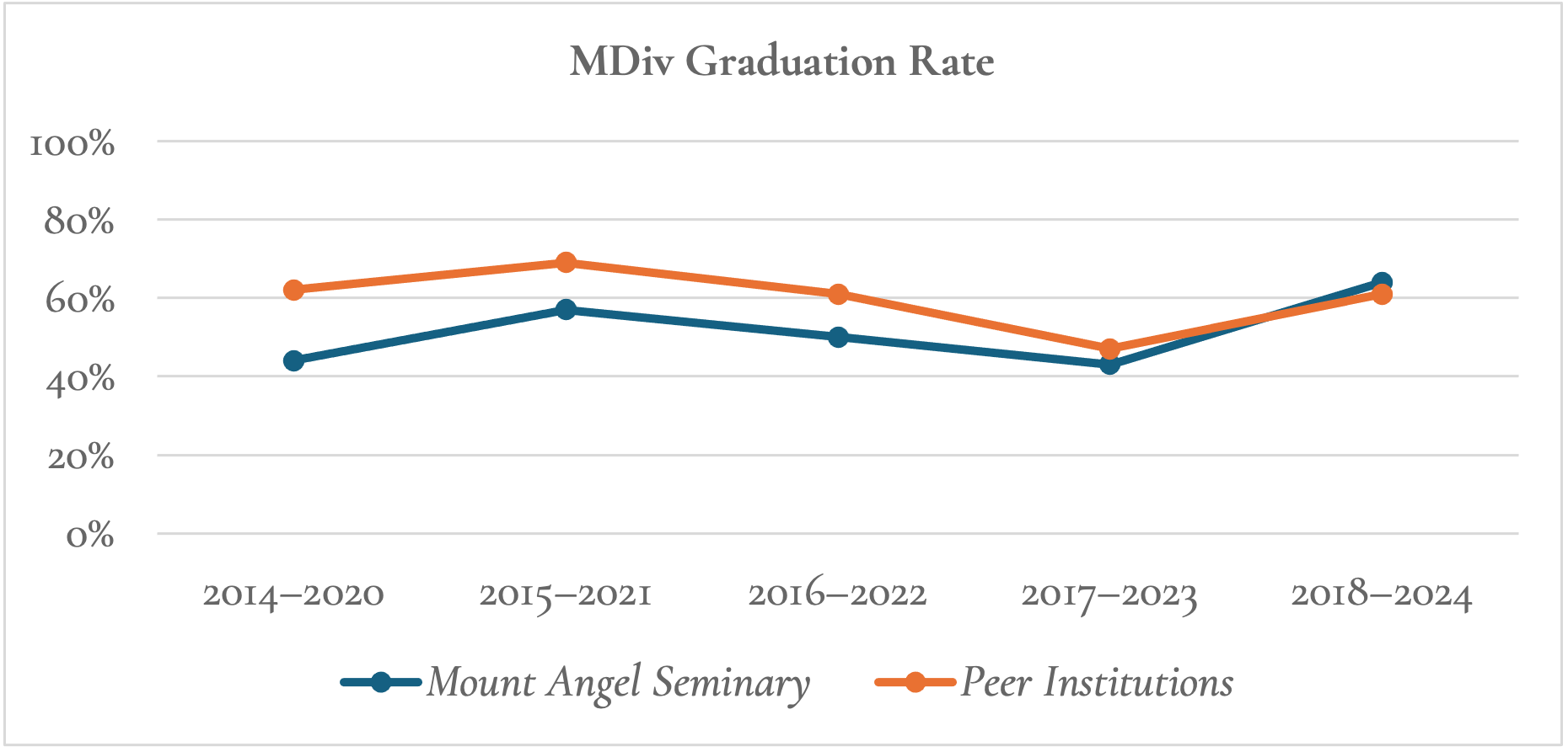 The total number of MDiv degrees completed between 2020 and 2024 is 42. The following table and chart show the graduation rate of the MDiv program in comparison with the average of certain other Catholic seminaries in the United States: