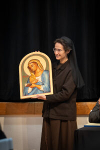At the conclusion of the symposium, Fr. Eirvin gave an icon on behalf of Abbot Jeremy to Sister Petrini in appreciation for her visit. Written by Br. Claude Lane, OSB, the icon, “Our Lady of Mount Vernon,” is based on a painting of the Virgin Mary reading a book that originally hung in the home of George Washington. Sister Petrini expressed her gratitude and joy to be at Mount Angel Seminary and engage with the community.